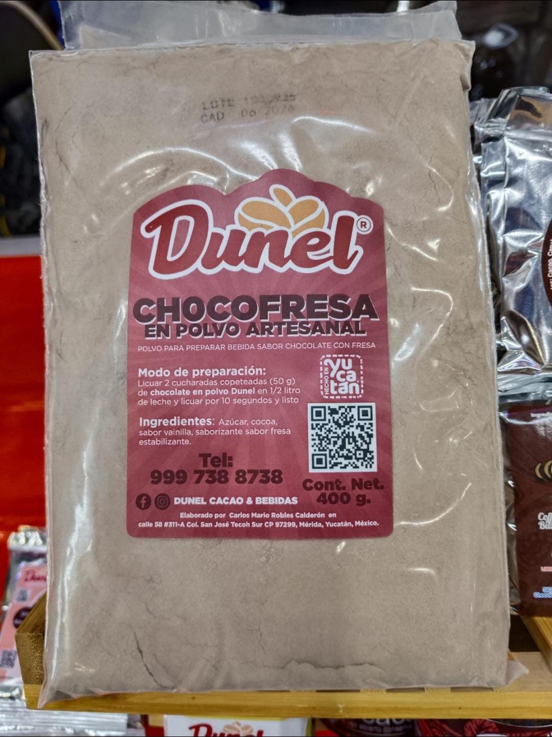 Polvo para preparar licuados fríos o calientes, con agua o leche. Dos cucharas son suficientes para 1/2 litro de bebida sabor chocolate con fresa. Rinde 4 litros.