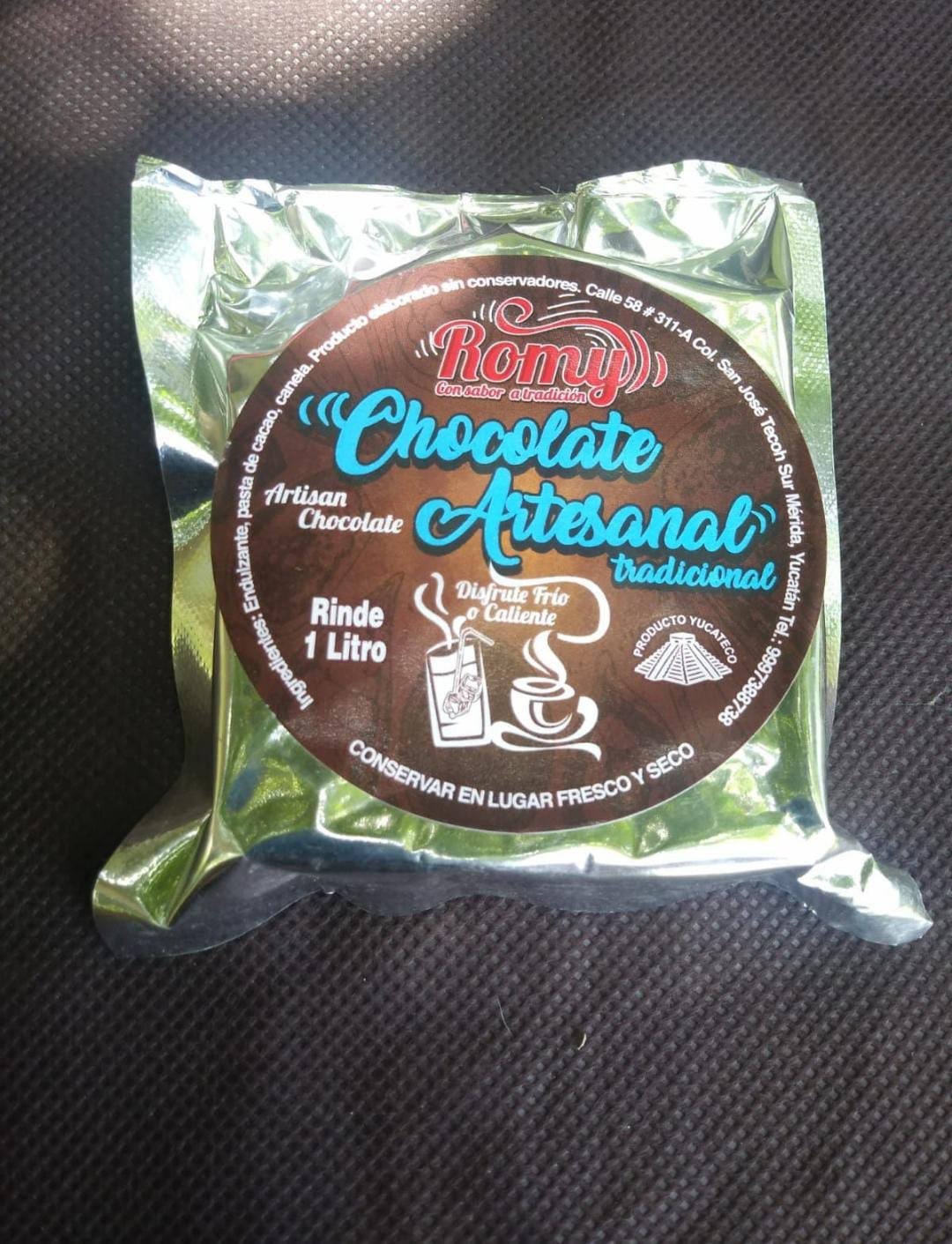 Tablilla de chocolate artesanal tradicional para preparar bebida fría o caliente, rinde 1 litro. Libre de gluten. Sin ingredientes de origen animal.